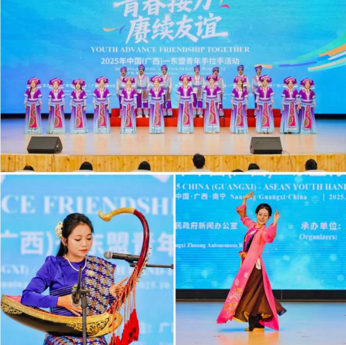 Vietnamese student Wu Mingying from Guangxi Arts University performed the dance "Impressions of Vietnam," while Myanmar student De Xin played "Melody of Love" on the saung, a traditional Burmese harp. The choir of Guangxi Minzu University presented "Song of Land and Sea - Guangxi's Intangible Cultural Heritage Sea Chant," using art as a bridge to showcase the fruitful achievements in cultural and artistic exchanges between Guangxi and ASEAN countries.