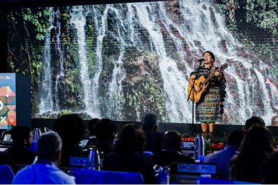 The evening opened with Sara Curruchich from Guatemala, the 2025 WFF Youth Singer of the Year. Coming from an Indigenous Maya Kaqchikel farming community, Sara is renowned for her powerful voice advocating for Indigenous rights. She performed Germina Libertad, alongside Mexican drummer Moty (Natalia Miranda), captivating the audience with melodies of resilience, connection to land and harmony with nature. Through her music, she reminded participants that culture and tradition play a vital role in shaping inclusive and sustainable agrifood systems.