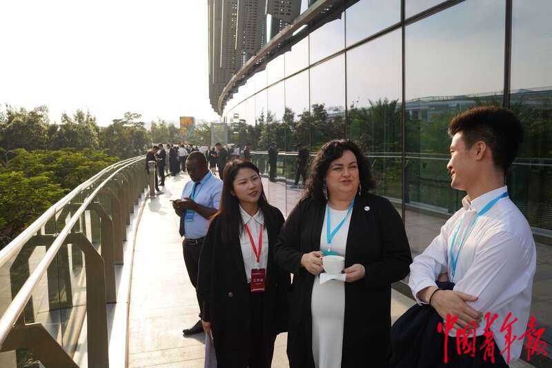 10月31日下午,2023年世界青年发展论坛青年发展型城市主题论坛茶歇期间,波兰青年组织理事会主席阿丽娜·普罗哈塞克(右二)等外国嘉宾与中国青年交谈。 中青报·中青网记者 李峥苨/摄