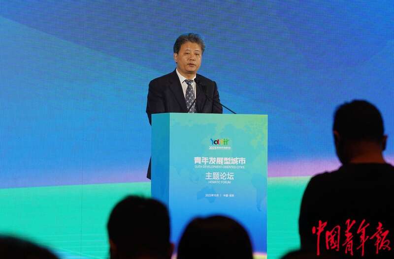 10月31日下午,2023年世界青年发展论坛青年发展型城市主题论坛上,住房和城乡建设部副部长秦海翔致辞。中青报·中青网记者 李峥苨/摄
