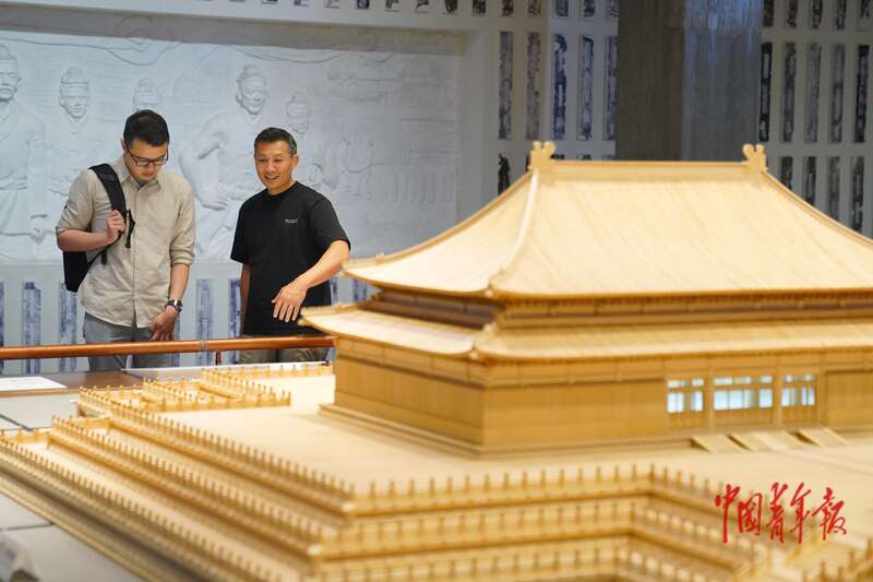 7月14日,江苏苏州,苏州御窑金砖博物馆,两名青年代表正在观看“紫禁城”建筑模型。中青报·中青网记者 田嘉硕/摄