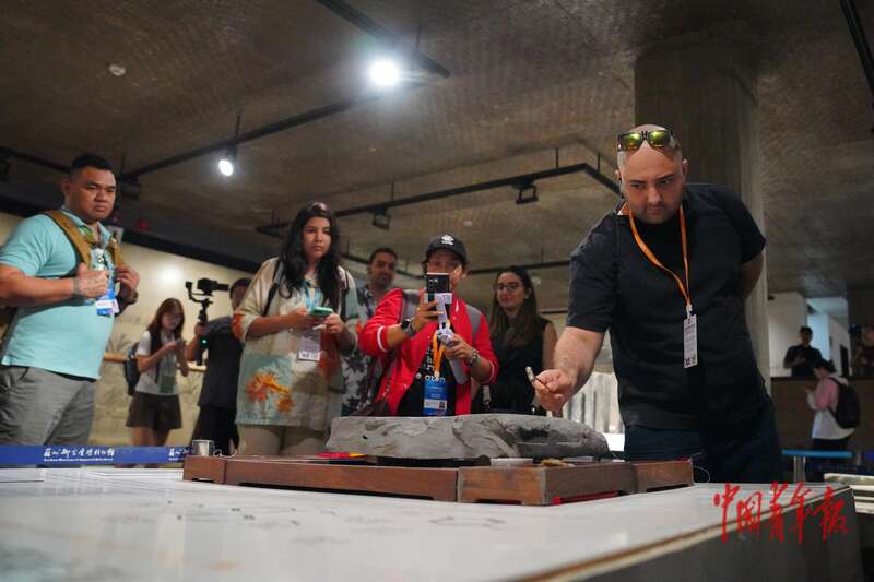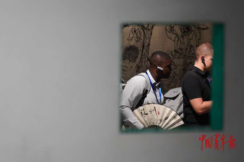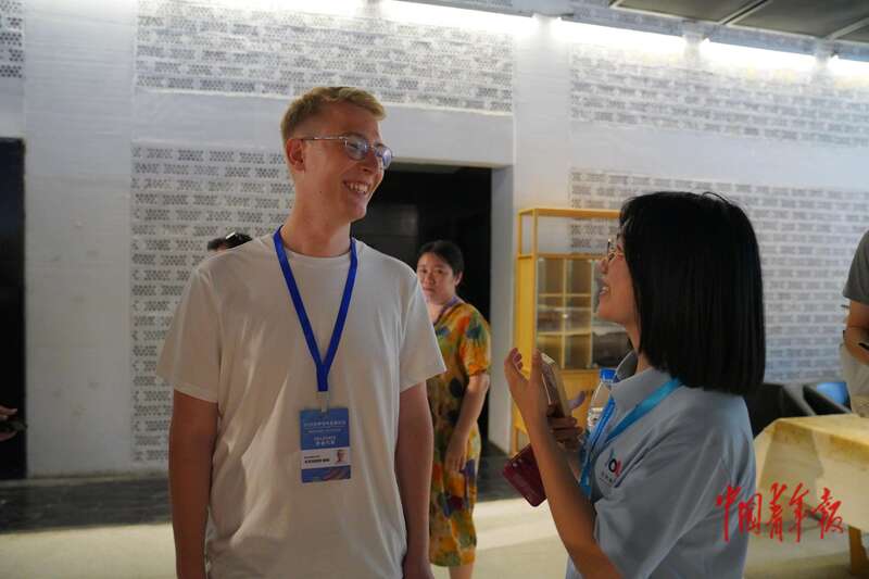 7月14日,江苏苏州,苏州御窑金砖博物馆,一名青年代表与中方志愿者友好交流。中青报·中青网记者 田嘉硕/摄