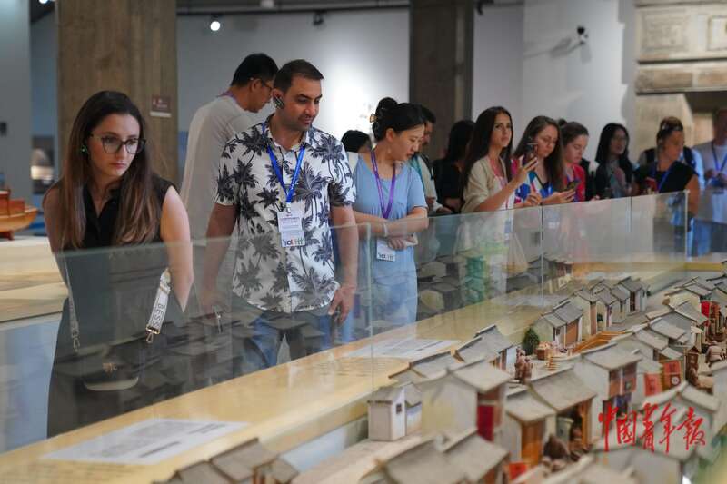 7月14日,江苏苏州,苏州御窑金砖博物馆,青年代表们正在参观苏州古城文化地标“陆墓老街”的建筑模型。中青报·中青网记者 田嘉硕/摄