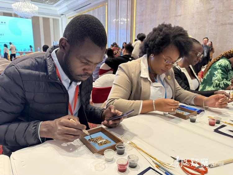 9月10日晚,第九届中非青年大联欢欢迎会在西宁举行。59名来自中非合作论坛非方成员的青年、其他大洲的非裔青年代表,以及来自23个非洲国家的记者齐聚一堂。活动现场通过精彩文艺展演、破冰游戏与非遗技艺体验,搭建起中非青年友谊桥梁,生动诠释了中非文明互鉴的深厚内涵。图为掐丝唐卡技艺现场教学。