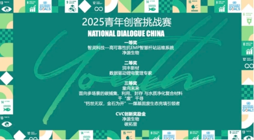 路演日现场,联合国开发计划署在官方微信视频号、Bilibili等平台对项目路演进行了全程直播。经过预路演选拔出的12支循环经济领域创业团队直面投资人,展现了青年一代对可持续发展问题的创新回应。经过激烈角逐,共产生一等奖团队2支,二等奖团队2支,三等奖团队4支。其中,“净源生物”与“智灵科技”两个项目脱颖而出,荣获本次挑战赛一等奖。“碳拓普科技”及“净源生物”两个项目获得由CVC资本提供的青年创新奖励金支持。